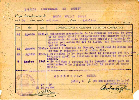 1939ko martxoaren 18an gerra-kontseilua egin zioten Cadizeko Kostako Artileriaren Kuartelean eta beste 14 urteko espetxe-zigorra ezarri zioten. Kendu egin zitzaizkion lanaren truke lortutako murrizketak eta baldintzapeko askatasunerako eskubidea. Epaitu ondoren Puerto de Santa Mariara itzuli zuten.
